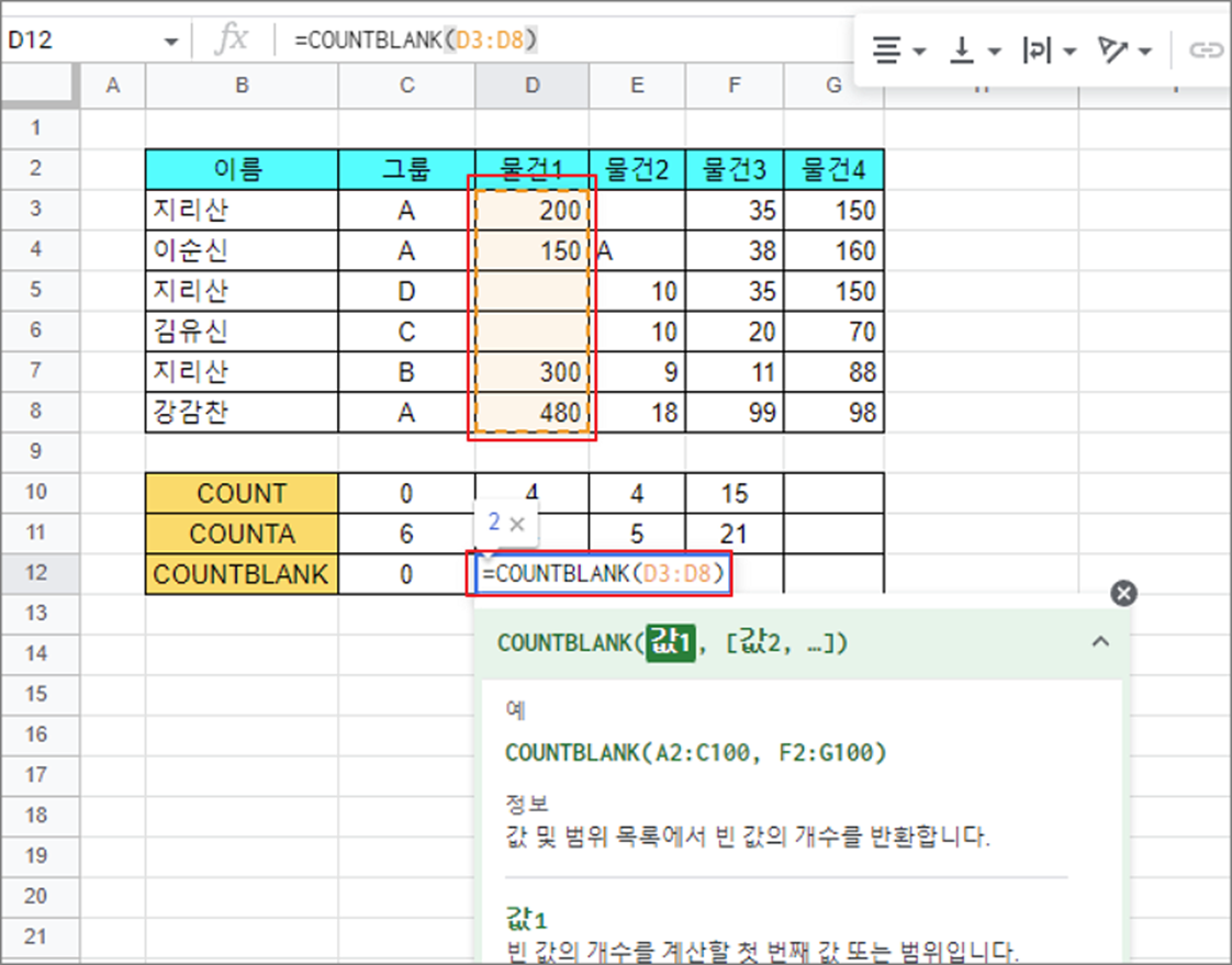 구글 스프레드시트 COUNTBLANK 빈 셀 개수 세기