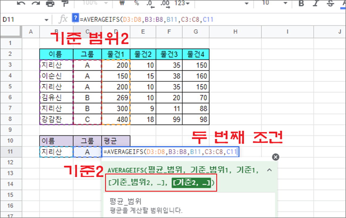 구글 스프레드시트 다중 조건 평균 구하기 AVERAGEIFS