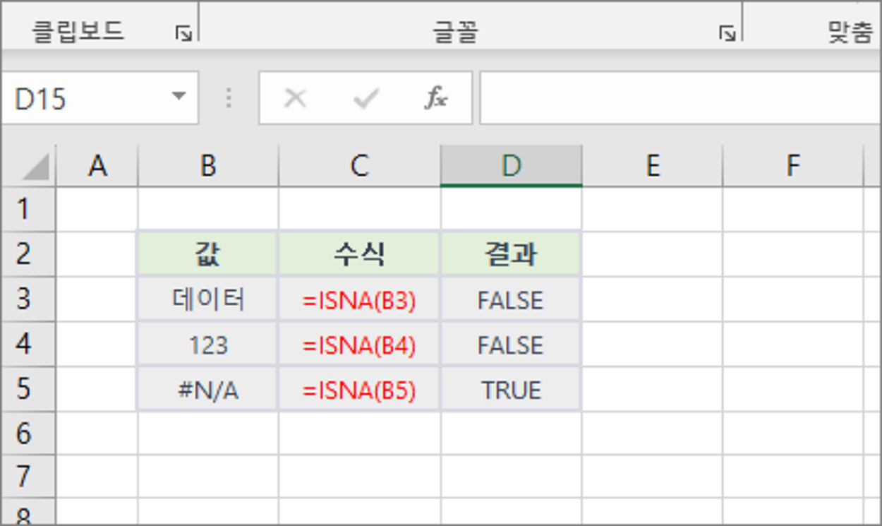 | =ISNA(값) l 값: 확인하고자 하는 값 또는 셀 참조 |
