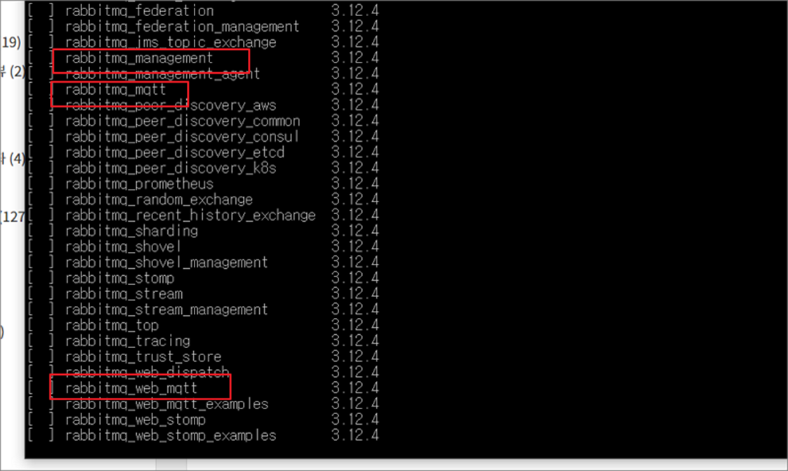 ▼ 아래 이미지에서 보이는 3가지 항목을 활성화 해야 합니다. 명령어는 rabbitmq-plugins enable [플러그인명] 입니다.