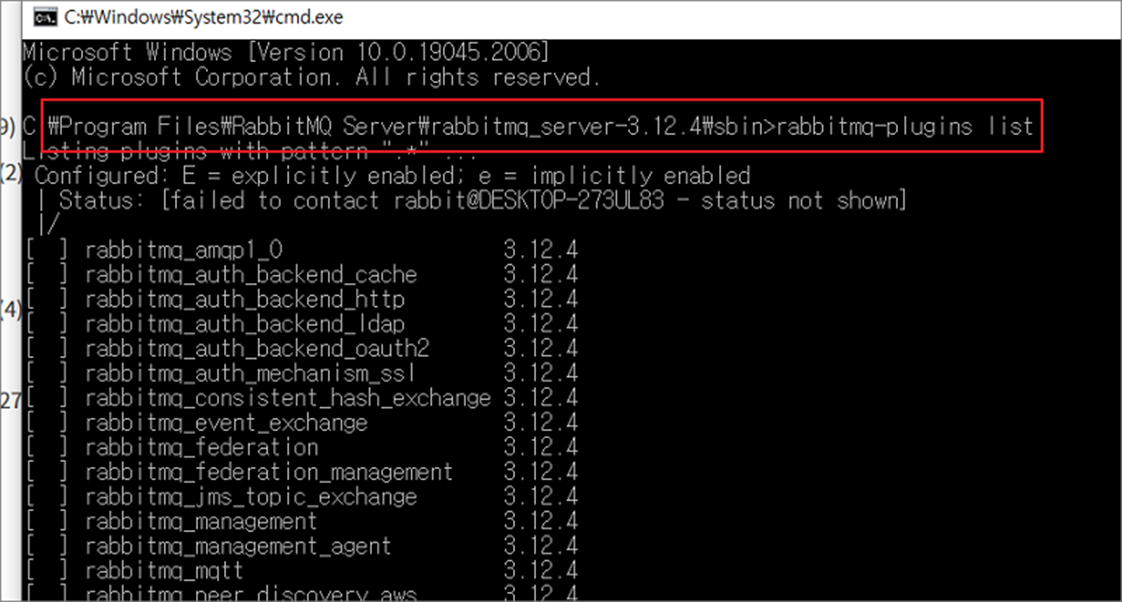 ▼ 이제 RabbitMQ 를 관리할 수 있는 웹 관리 화면을 띄워보겠습니다. 그러기 위해서는 콘솔에서 관련 플러그인을 활성화해야 합니다. RabbitMQ 가 설치된 폴더로 가서 다음 명령어를 실행합니다. 플러그인 실행 여부를 알수 있는 명령어입니다.