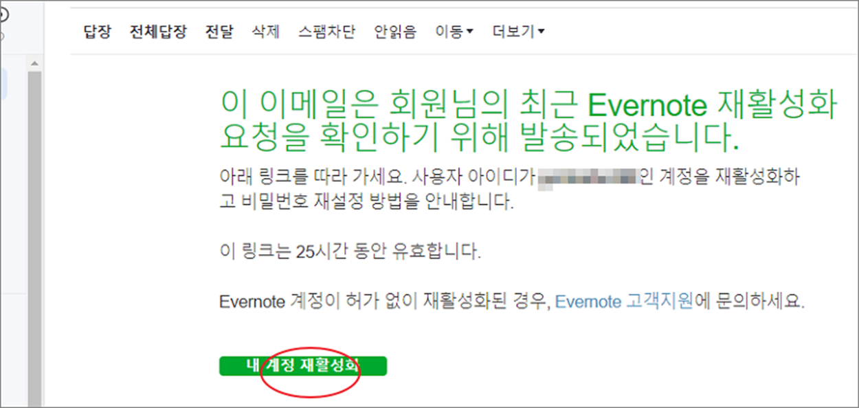 ▼ 이제 에버노트에서 보낸 메일을 확인해야 합니다. 계정 메일 주소로 가서 에버노트에서 보낸 내용을 보시면 “내 계정 재활성화” 버튼을 볼 수 있습니다.