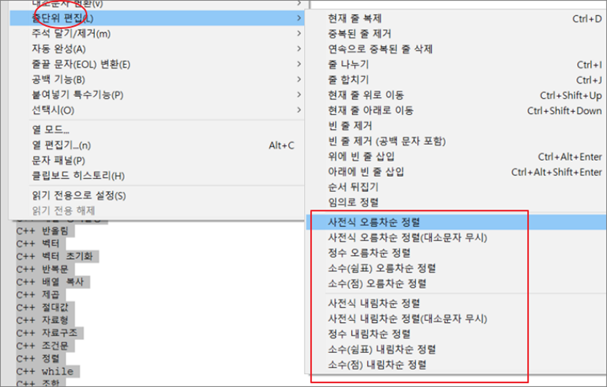 ▼ 줄단위 편집 메뉴 하위에는 다양한 종류의 정렬 옵션들을 제공합니다. 크게 오름차순과 내림차순으로 나누고 있으며, 쉼표, 점, 대소문자 무시 등 여러 방식으로 정렬방식을 나눕니다.