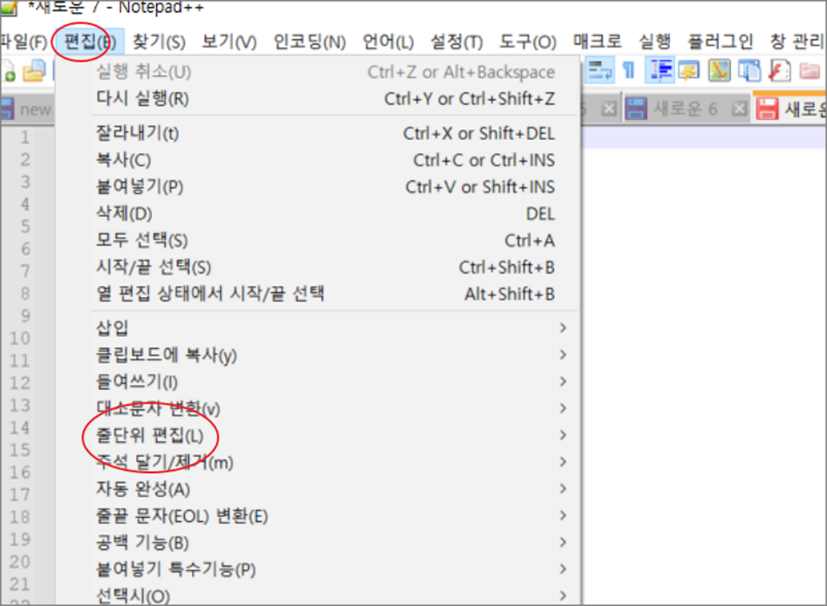 ▼ 다음 상단 편집 > 줄단위 편집 메뉴를 선택합니다.