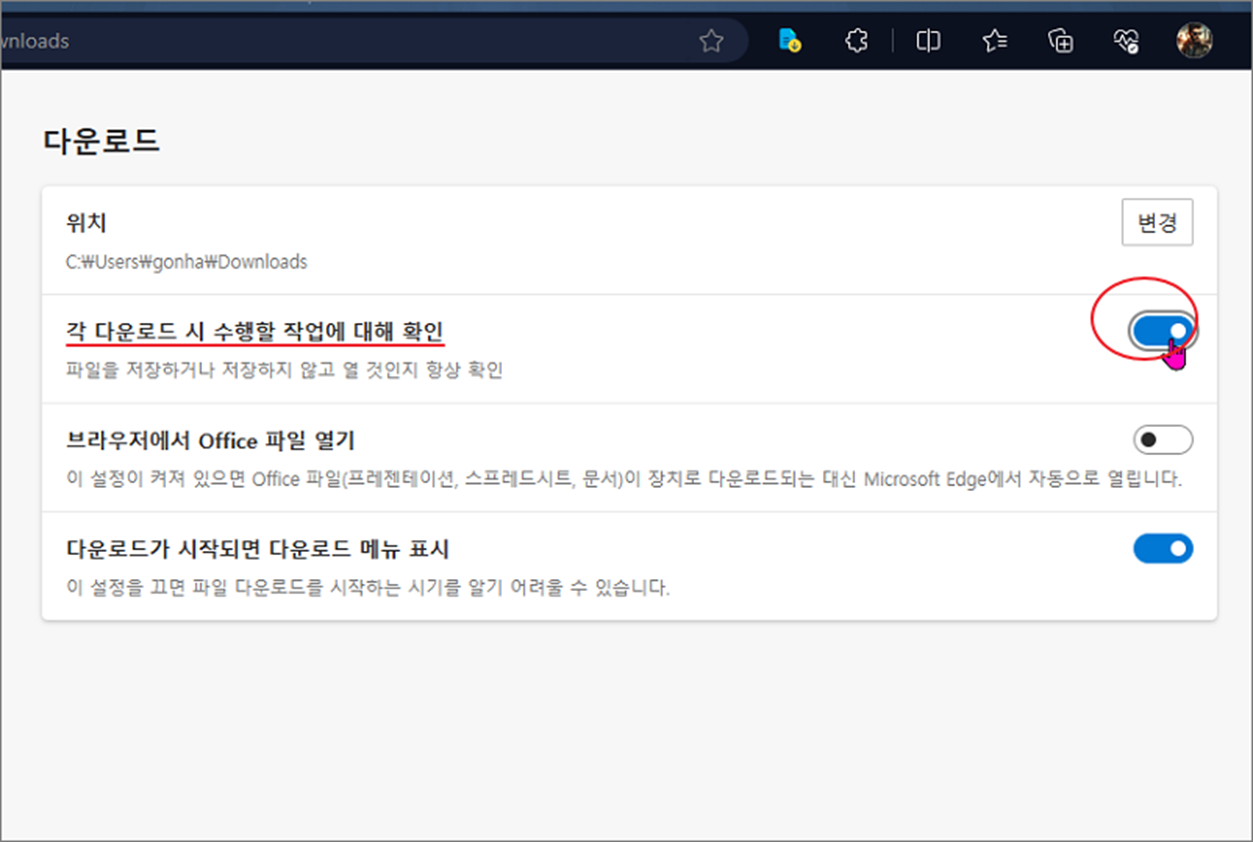 윈도우11 엣지 브라우저 다운로드 위치 변경하기