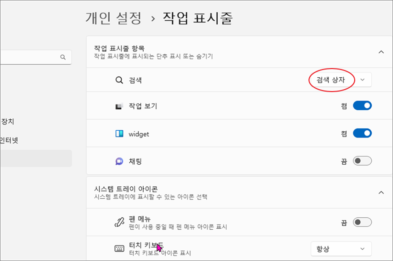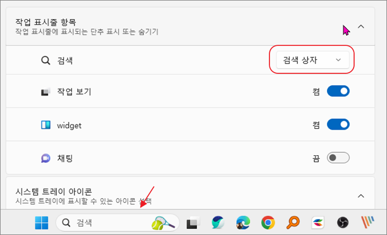 윈도우11 작업표시줄 검색창 줄이거나 없애기