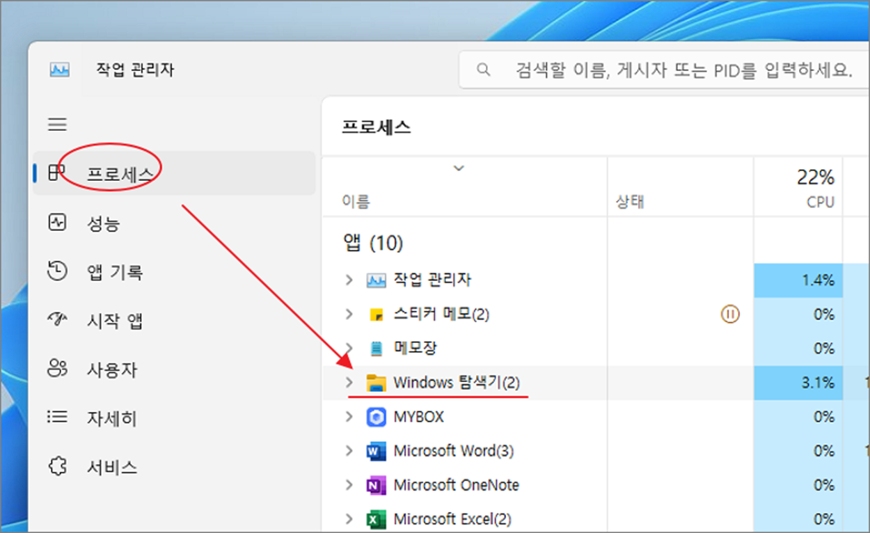 ▼ 작업 관리자 창이 뜨면 왼쪽 사이드에 "프로세스" 메뉴를 선택합니다. 오른쪽 화면에 뜬 다양한 프로세스 목록에서 "파일 탐색기" 를 찾아야 합니다. 상단 탭을 눌러서 이름으로 정렬하거나 검색 창을 이용해서 파일 탐색기를 찾으시기 바랍니다.