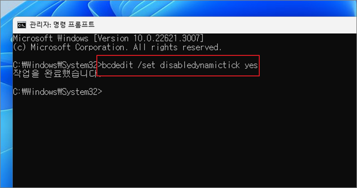 작업이 완료되었다는 메시지가 뜨면 끝난 것입니다. 다이나믹틱(Dynamic Tick) 은 Windows의 전력 관리 기능 중 하나입니다. 시스템이 낮은 부하에서는 타이머 빈도를 줄이고, 높은 부하에서는 빈도를 높여 전력 소모를 최적화하는 기능입니다. 이 기능은 정확히 탐색기에 영향을 주는지는 모르겠지만 일부 시스템에서 문제를 일으키기 때문에 조치 방법중에 하나로 언급되고 있습니다.