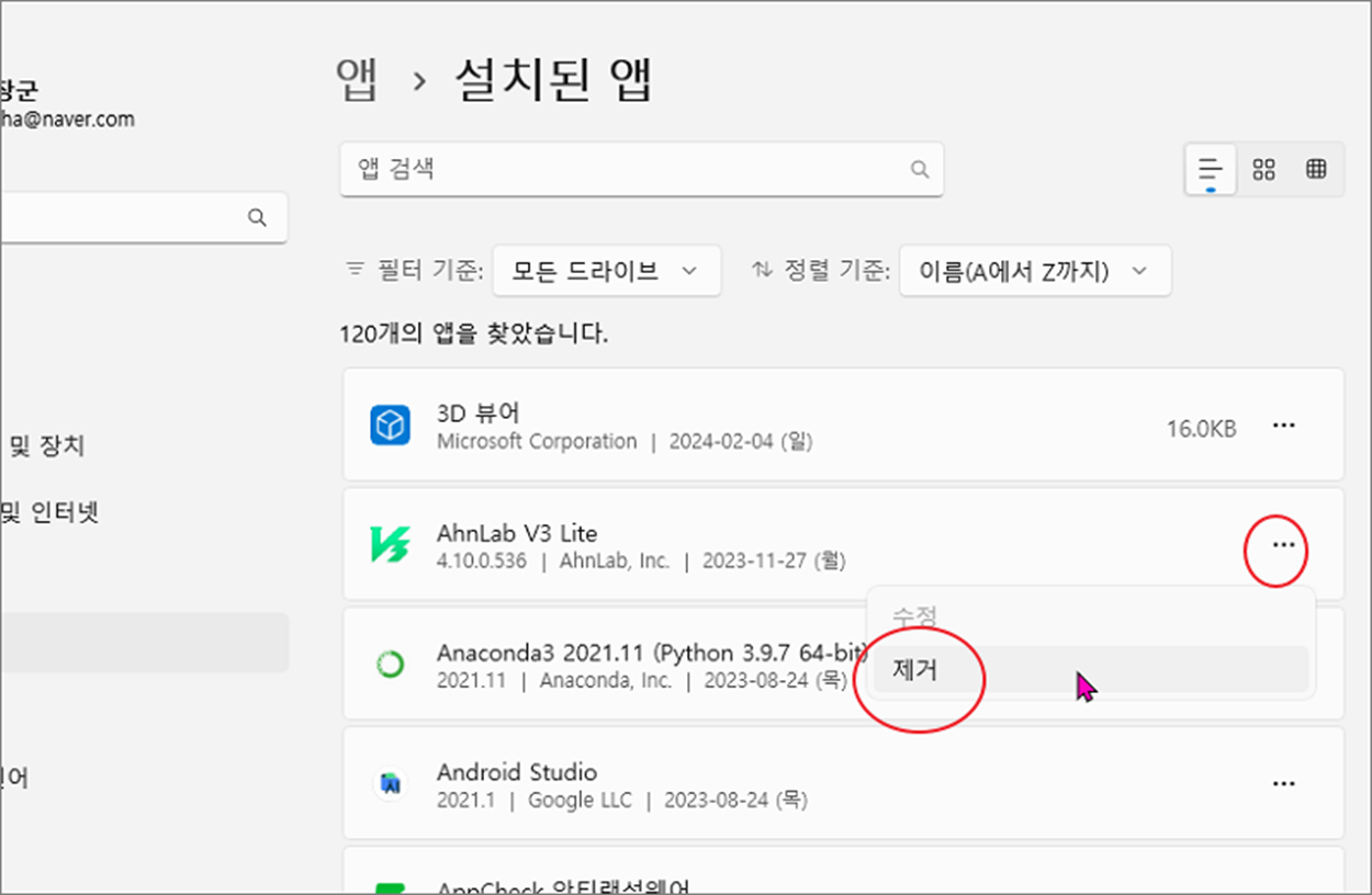 ▼ 제거 방법은 간단합니다. 앱 오른쪽 끝에 더보기 > 제거 메뉴를 클릭합니다.