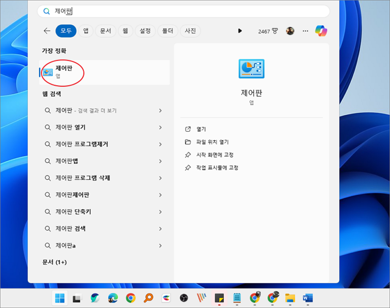 ▼ 다음은 윈도우 11 이전 버전인 윈도우 10 에서 제어판을 통해 프로그램을 삭제하는 방법입니다. 검색에서 "제어판"을 찾아 실행합니다.