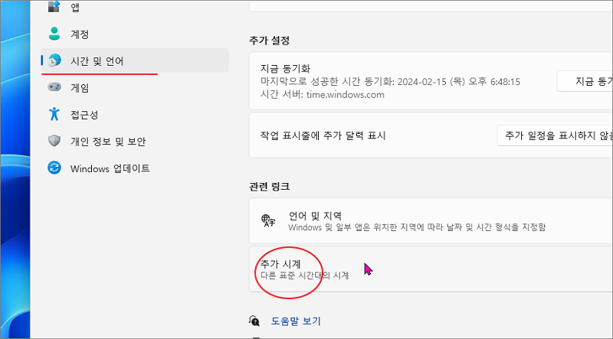 ▼ '설정' 화면으로 이동하시고 아래로 내려가서 '추가시계' 버튼을 클릭합니다.