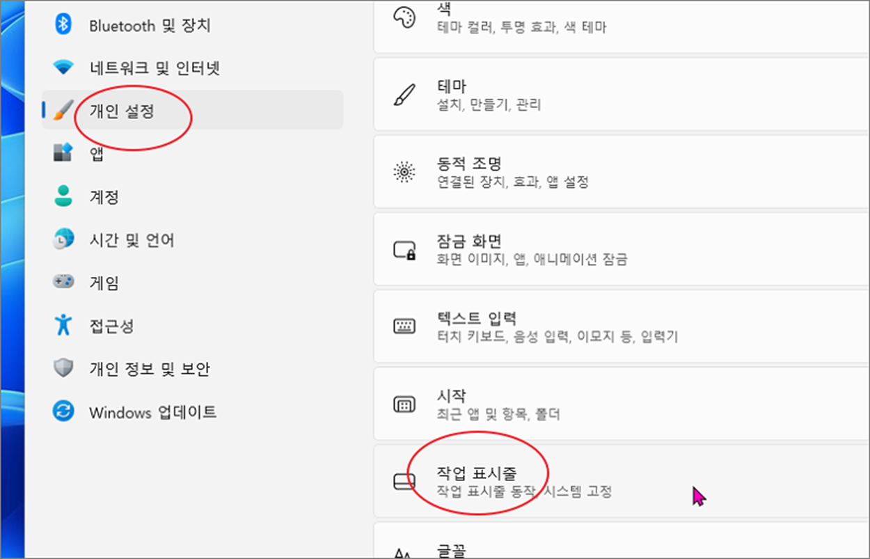 ▼ 다음은 시계를 초단위로 표시하는 방법입니다. '설정' 에서 '개인 설정' 메뉴로 이동합니다. 그리고 '작업표시줄' 메뉴를 클릭해서 상세 설정으로 이동합니다.