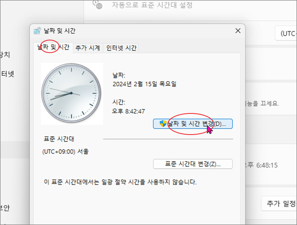▼ 창이 뜨면 '날짜 및 시간' 탭 으로 이동해서 '날짜 및 시간' 변경 버튼을 클릭합니다.