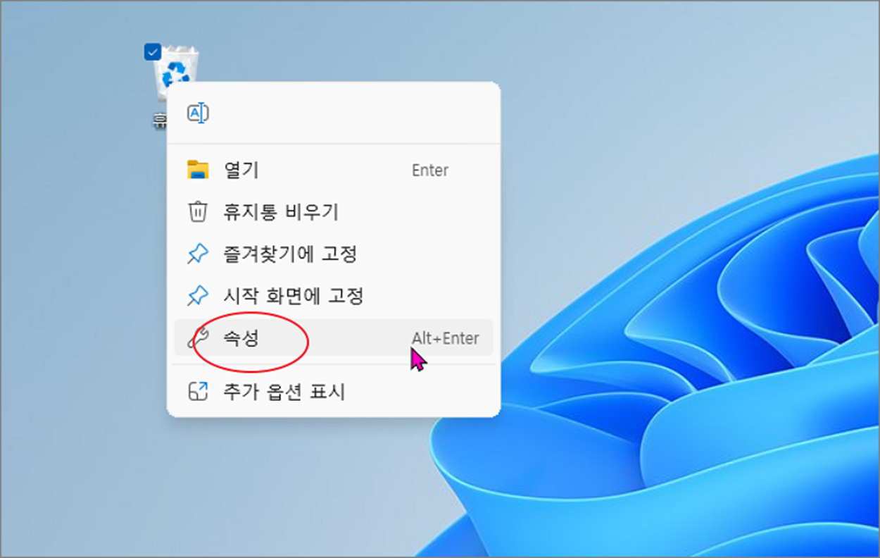 ▼ 이렇게 바탕화면에 휴지통 아이콘을 추가했다면 오른쪽 마우스를 선택해서 클릭해서 "속성" 정보 창을 띄웁니다.