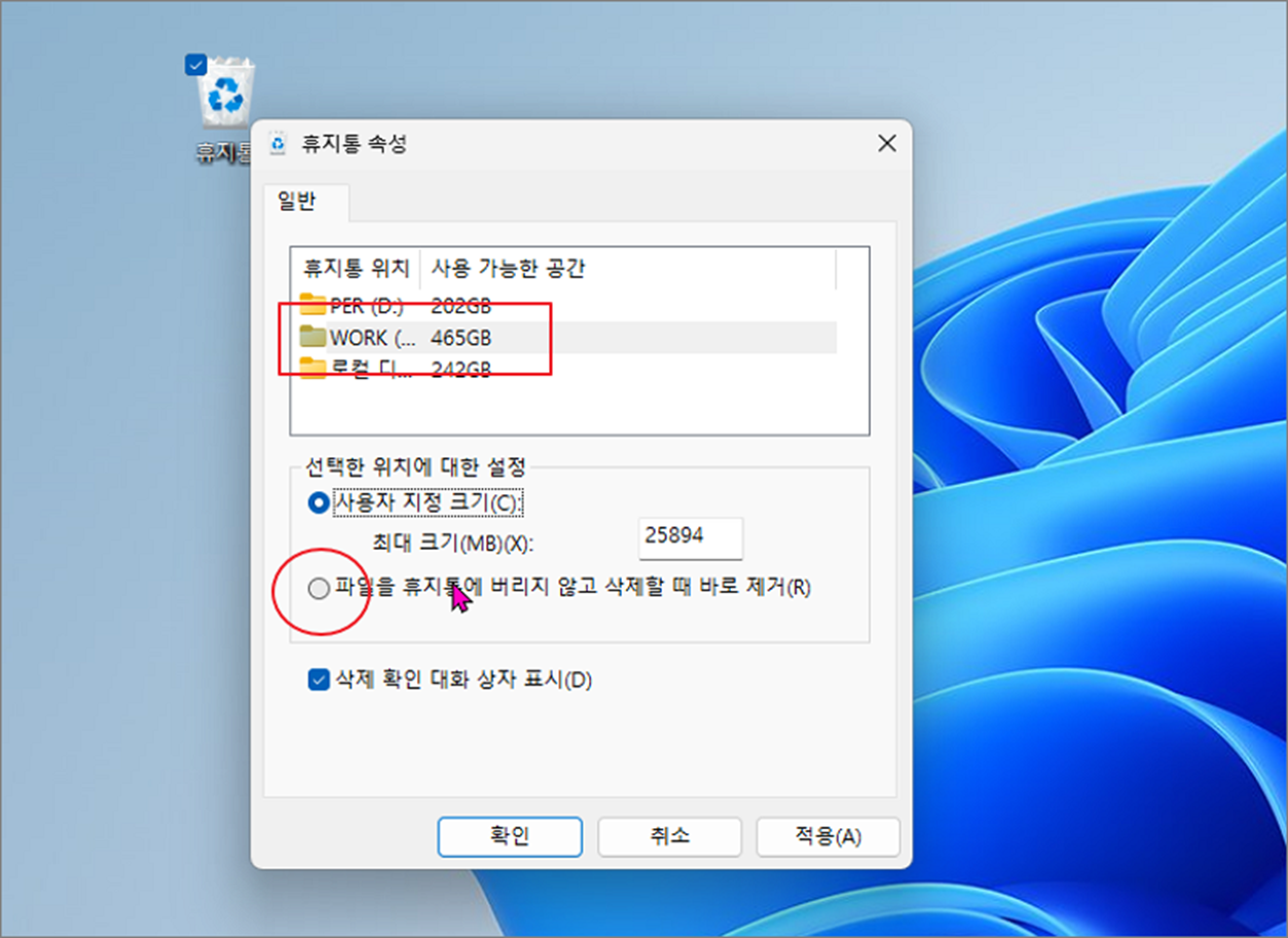 ▼ 휴지통 속성 정보에는 두가지 옵션이 있는데 "파일을 휴지통에 버리지 않고 삭제할 때 바로 제거" 를 선택하고 적용을 누릅니다. 그런데 여기서 주의할 점은 현재 선택한 드라이버가 D 라는 것입니다. 그러니까 D 드라이버에서 파일을 삭제했을 때 휴지통에 들어가지 않고 바로 삭제할 수 있는 설정이 적용되었다는 의미입니다.