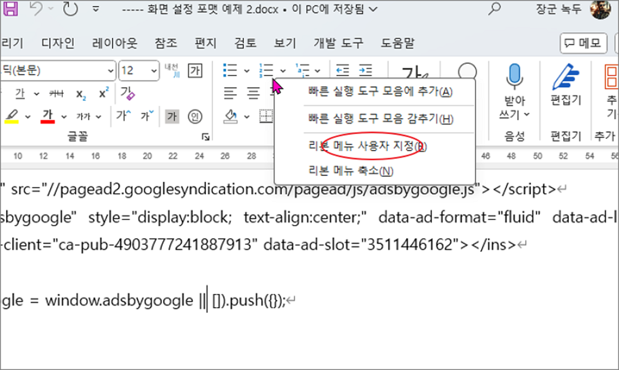▼ 먼저 새 탭과 그 속에 리본 메뉴를 추가해 보겠습니다. 리본 메뉴 수정 페이지로 이동하기 위해 오른쪽 마우스를 클릭합니다. 그리고 화면에 뜬 메뉴에서 “리본 메뉴 사용자 지정” 을 클릭합니다.