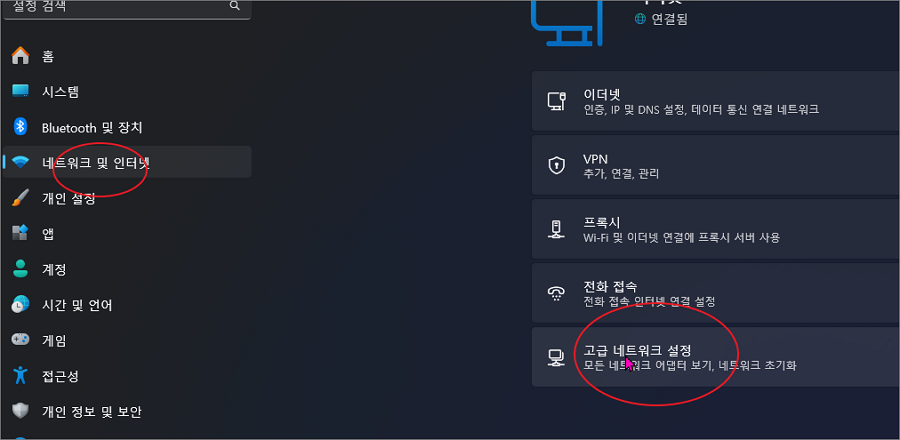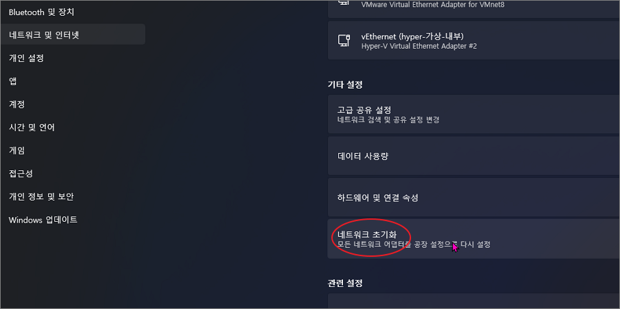 둘째, 네트워크 어댑터 초기화를 통해 잘못된 설정을 리셋합니다.