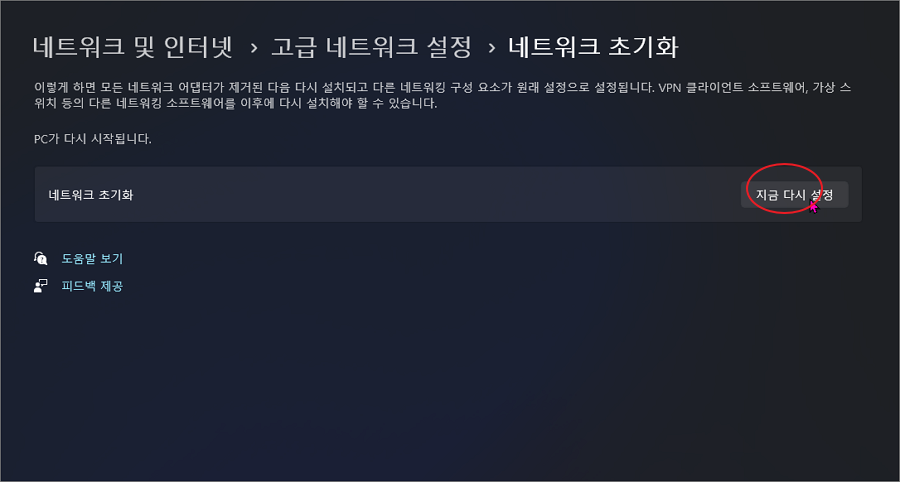 네트워크 초기화 버튼을 누르면 컴퓨터가 재부팅되고, 모든 네트워크 설정이 초기화됩니다.